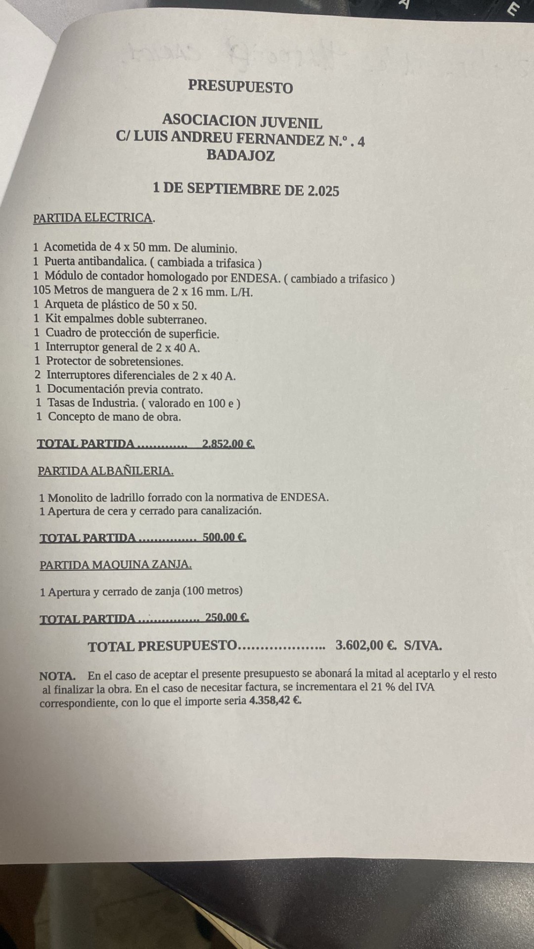 Para realizarlo, tenemos que hacer obra, una zanja desde la calle Francisco Hinchado Madera hasta la sede de la AGJ. Esto implica la mano de obra de albañilería, alquiler de maquinaria, electricista,... Precio de la obra, 3.602,00 €.