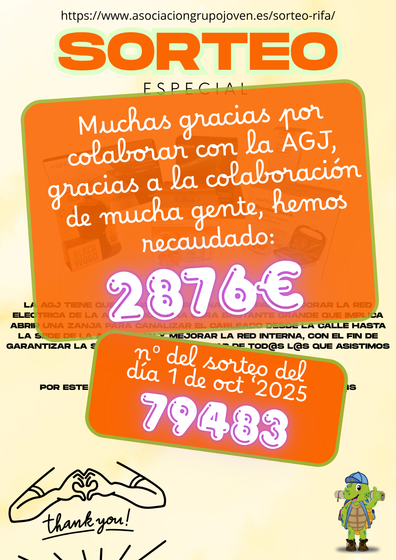 El día 1 de octubre, se sorteó el lote arriba anunciado, rifa para colaborar con la obra que está ejecutando la AGJ para renovar la instalación eléctrica en la sede.